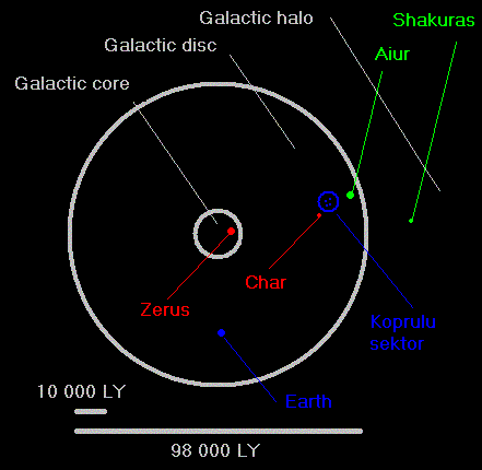 Nor StarCraft neither BroodWar contains any positional data. It´s known, that the area is somewhere on the Galaxy rim cca 60 000 light years far away from the Earth. Terran worlds are in the sector known as Koprulu. It is likely, that the main worlds (Tarsonis, Korhal, Umoja and Moria) lies not far from each other. Chau Sara and Mar Sara were probably recently founded colonies on the borders Antiga is a border colony (mentioned in one of the pre-briefings). All remaining Terran worlds are within the sector. The size of the sector is the subject of the next paragraph.